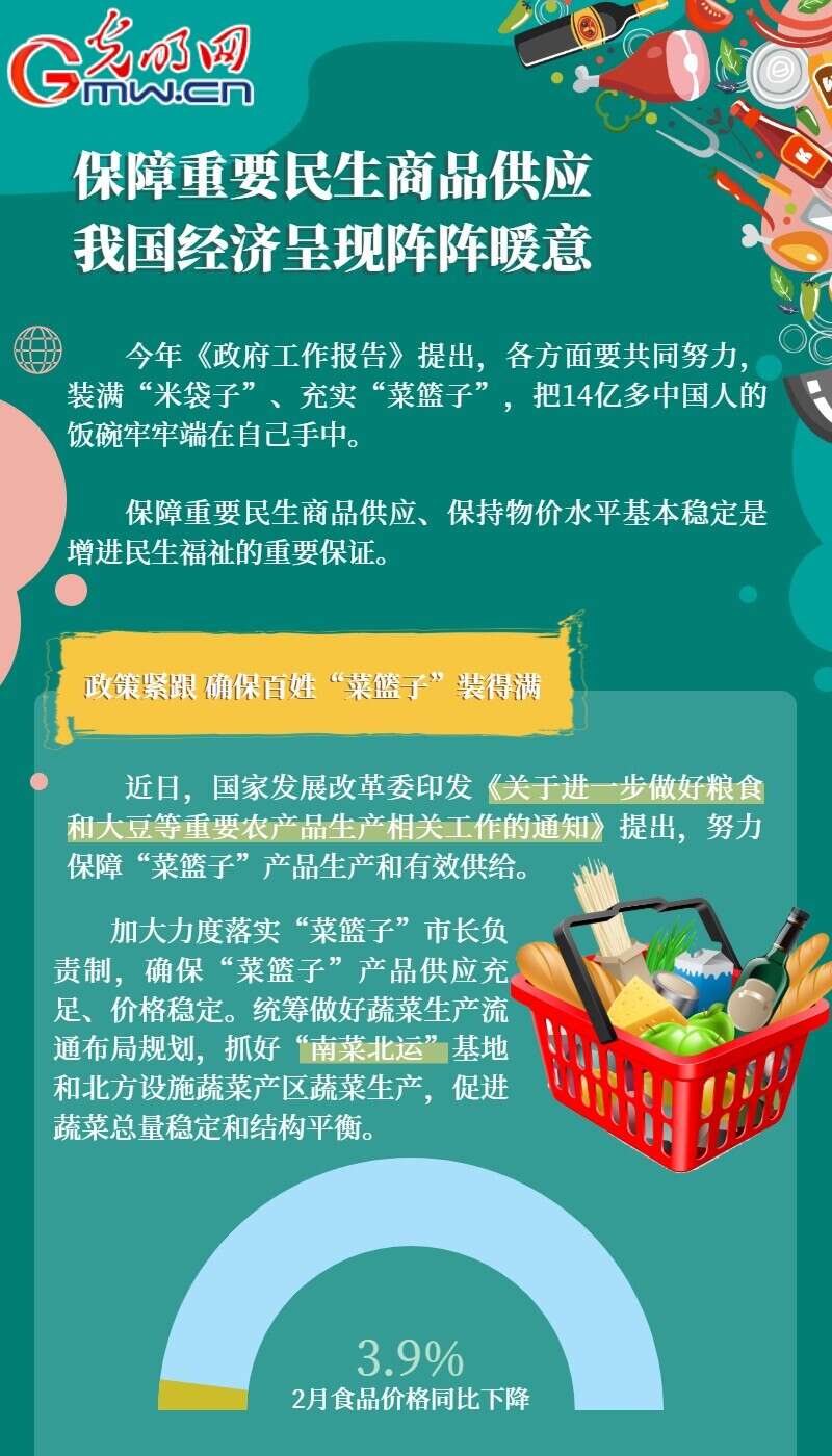 光明网讯 今年《政府工作报告》提出,各方面要共同努力,装满“米袋子”、充实“菜篮子”,把14亿多中国人的饭碗牢牢端在自己手中。保障重要民生商品供应、保持物价水平基本稳定是增进民生福祉的重要保证。