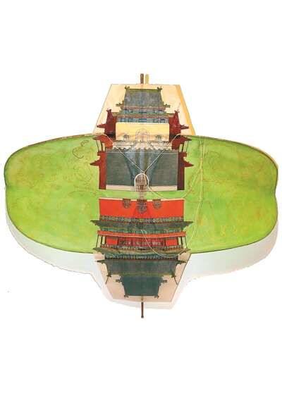 随着想法不断修正,每一个风筝的图案都被推倒过数次。“比如一开始钟鼓楼是分开做的,我分别设计了钟楼和鼓楼。做着做着就觉得,大家一想到鼓楼,钟楼就出来了,一想到钟楼,鼓楼就出来了,钟鼓楼钟鼓楼,就跟老公母俩似的,一直在这待着,不能给分开了”。可是问题来了,怎么把它俩合在一个风筝画片上?琢磨半天,他想出用三维空间的手法表现,于是风筝上边画的钟楼,后边是鼓楼的影子;下边画的鼓楼,高出一块是钟楼的影子,出来一看,“就是‘你中有我,我中有你’的钟鼓楼。”