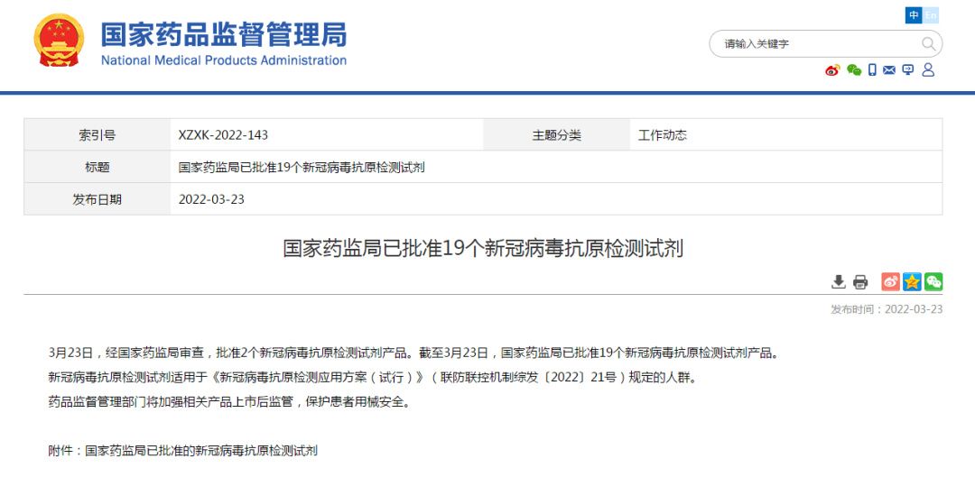 记者从国家药监局获悉,3月23日,经国家药监局审查,批准2个新冠病毒抗原检测试剂产品。截至3月23日,国家药监局已批准19个新冠病毒抗原检测试剂产品。新冠病毒抗原检测试剂适用于《新冠病毒抗原检测应用方案(试行)》(联防联控机制综发〔2022〕21号)规定的人群。国家药监局表示,药品监督管理部门将加强相关产品上市后监管,保护患者用械安全。