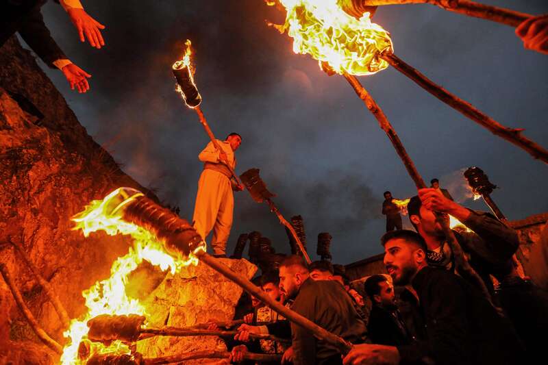 3月20日,人们在伊拉克库尔德自治区的小城阿克拉举起火把欢庆诺鲁孜节。伊拉克库尔德自治区民众20日举行庆祝活动,迎接诺鲁孜节。新华社/法新