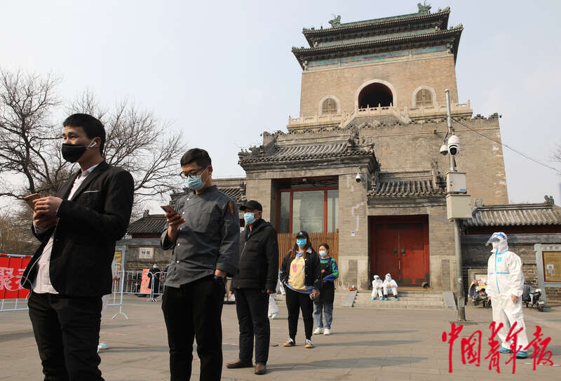 3月23日,位于北京中轴线上的东城区钟鼓楼文化广场核酸采样点,市民保持一米线间隔排队等待核酸采样。据介绍,根据疫情防控工作需要,东城区持续加大重点点位核酸检测频次,加强对部分重点人群核酸筛查。多家医院选派医务工作者全力支援所在街道的疫情防控工作,医院检验科PCR实验室做到所有核酸标本随到随检。中青报·中青网记者 陈剑/摄