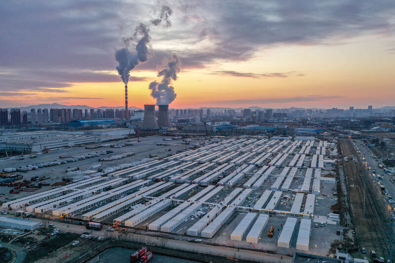 这是3月20日傍晚拍摄的吉林市高新南区隔离方舱建设现场(无人机照片)。3月20日,记者在吉林市高新南区隔离方舱建设现场看到,5000余名工人和百余台工程机械加班加点同时施工作业,为工程建设提速。新华社记者 张楠 摄