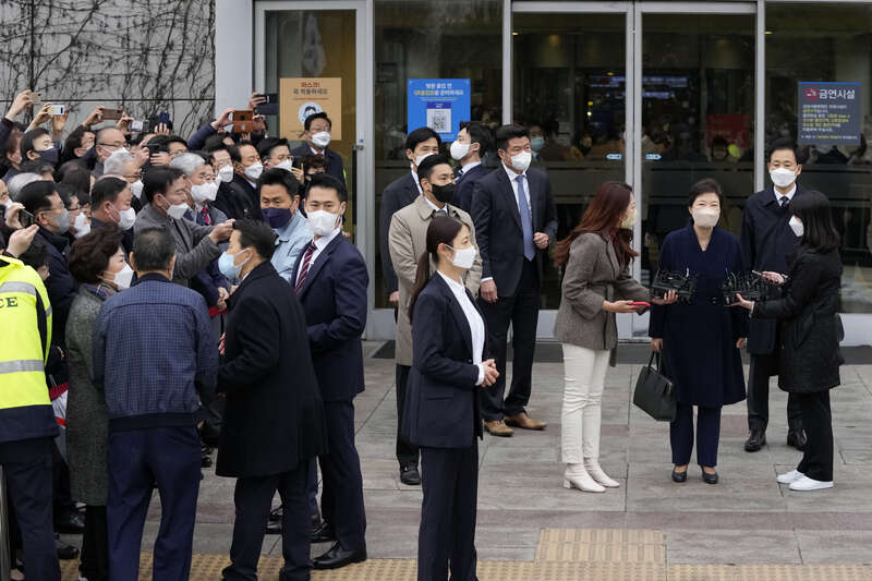 3月24日,韩国前总统朴槿惠(右三)从首尔江南区三星首尔医院出院时接受采访。朴槿惠因患病于2021年11月22日起接受住院治疗。2021年12月24日,韩国政府宣布,朴槿惠于12月31日获得特赦。2022年3月24日,朴槿惠结束住院治疗返回家中。新华社/美联
