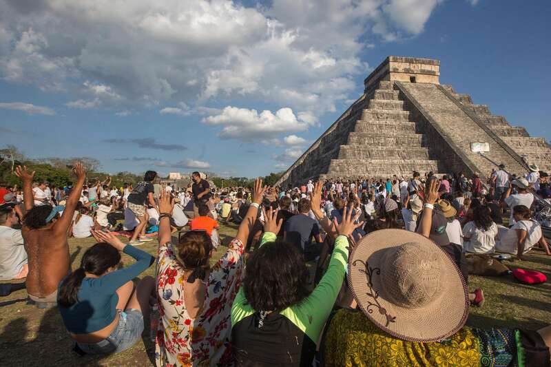 3月21日,人们围绕在墨西哥尤卡坦州奇琴伊察遗址内的库库尔坎金字塔旁庆祝春分日。