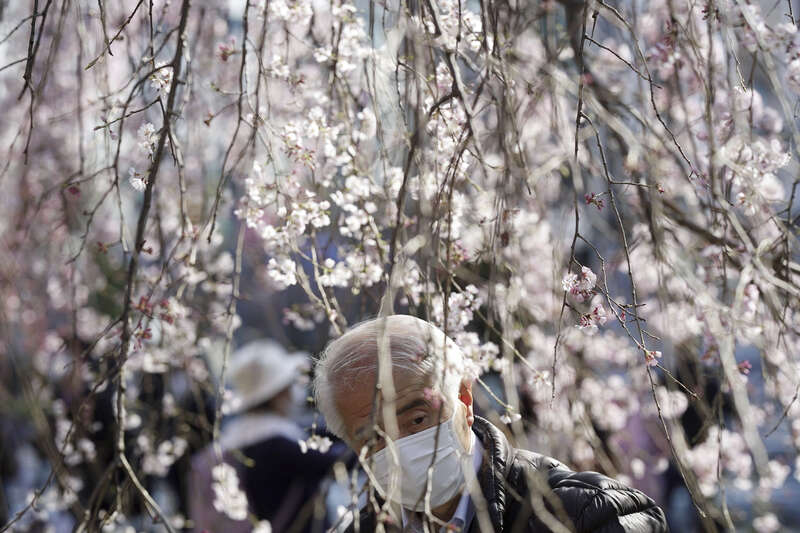 3月24日,一名戴口罩的男子在日本东京上野公园观赏樱花。新华社/美联