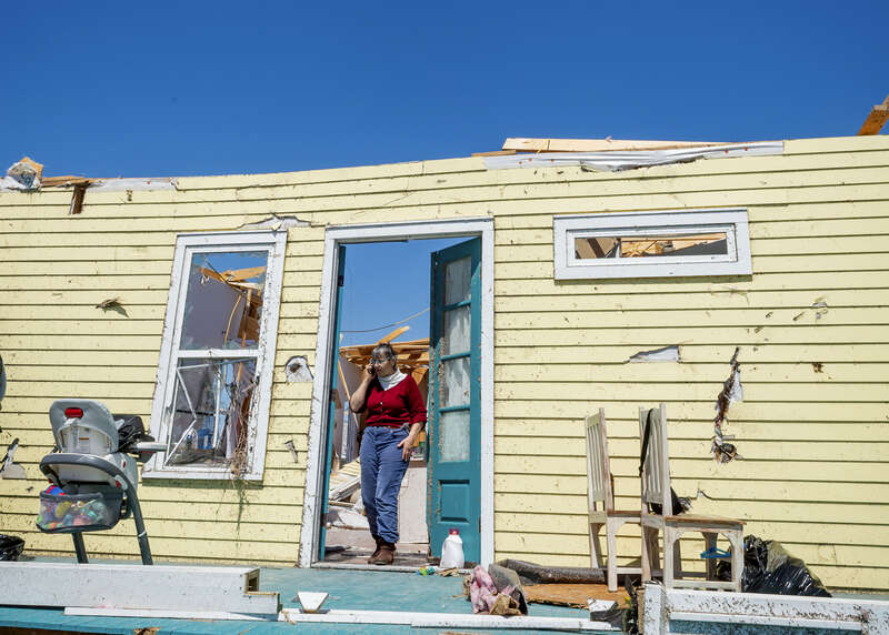3月23日,一名女子站在美国路易斯安那州阿拉比一座遭受龙卷风破坏的房屋内。美国中南部和南部地区近日持续遭遇龙卷风等恶劣天气,截至23日已有至少两人死亡、数十人受伤,大量建筑物受损。新华社/美联