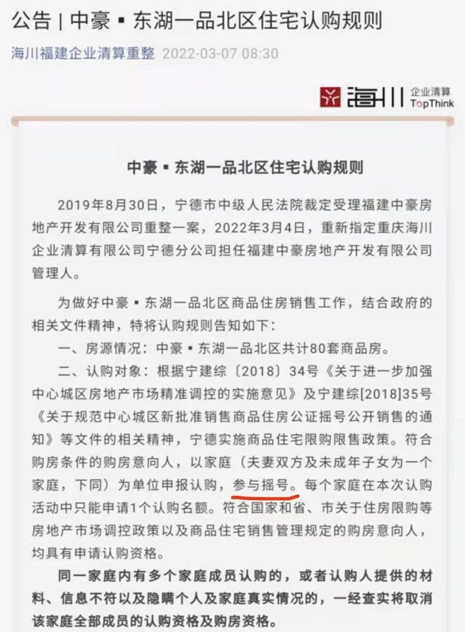 林平告诉记者,3月7日,福建中豪房地产开发有限公司管理人(以下简称管理人)发布《中豪·东湖一品北区住宅认购规则》,将以摇号方式销售80套商品房。“由于坊间盛传这些房源每平方米售价在1万元左右,比市场价格低一半,所以我就抱着碰碰运气的想法,把摇号当抽奖,买到的话就赚个百把万。于是花了2天时间排队准备征信材料和银行存款,并按要求用邮政快递将材料寄给中豪管理人,然后等待摇号的消息。”