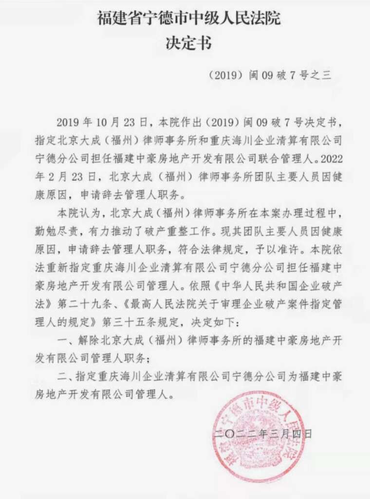 2022年3月4日,宁德中院作出的一份“决定书”写明:解除北京大成(福州)律师事务所的中豪公司管理人职务,指定重庆海川企业清算有限公司宁德分公司为中豪公司管理人。