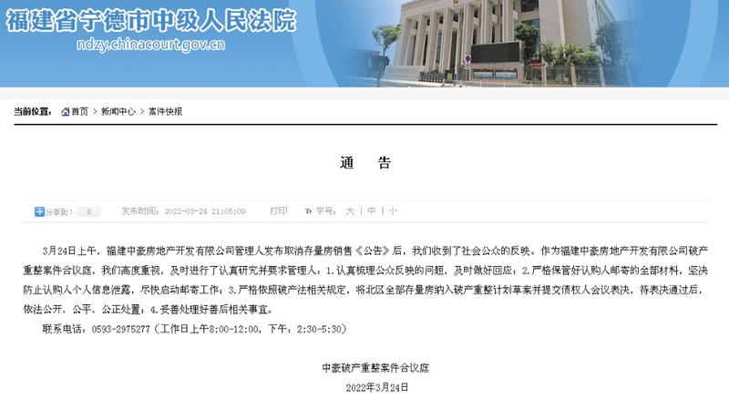 3月24日晚,宁德市中级人民法院官网发布信息称,“福建中豪房地产开发有限公司管理人发布取消存量房销售《公告》后,我们收到了社会公众的反映。作为福建中豪房地产开发有限公司破产重整案件合议庭,我们高度重视,及时进行了认真研究并要求管理人:1、认真梳理公众反映的问题,及时做好回应;2、严格保管好认购人邮寄的全部材料,坚决防止认购人个人信息泄露,尽快启动邮寄工作;3、严格依照破产法相关规定,将北区全部存量房纳入破产重整计划草案并提交债权人会议表决,待表决通过后,依法公开、公平、公正处置;4、妥善处理好善后相关事宜。”