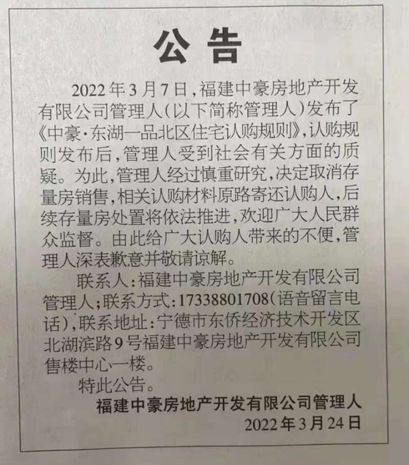 3月24日,福建中豪房地产开发有限公司管理人在中共宁德市委机关报《闽东日报》刊发《公告》称,《中豪·东湖一品北区住宅认购规则》发布后,受到社会有关方面的质疑。为此,管理人经过慎重研究,决定取消存量房销售,相关认购材料原路寄还认购人。