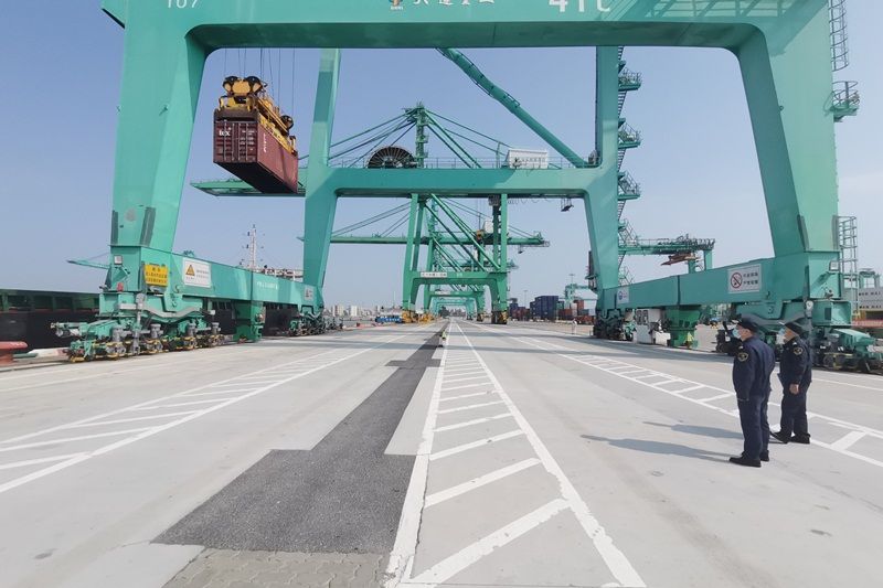 图为:关员对广澳港开通“一带一路”新航线出口货物进行监装 柯家进/摄