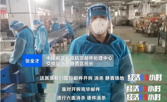 在中国邮政北京航空邮件交换站,每天将消杀、静置12万件来自海外的货物。由于实行严格的闭环管理,记者无法进入拍摄。工作人员张全才帮助记者记录了他们真实的工作场景。