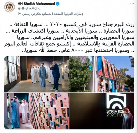 阿勒马克图姆在推特上发布了自己参观迪拜世博会叙利亚馆的照片,称赞叙利亚文化对伊斯兰文明和世界文明的重要性。