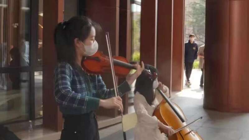 在校园核酸检测的队伍旁,有人拿起乐器演奏