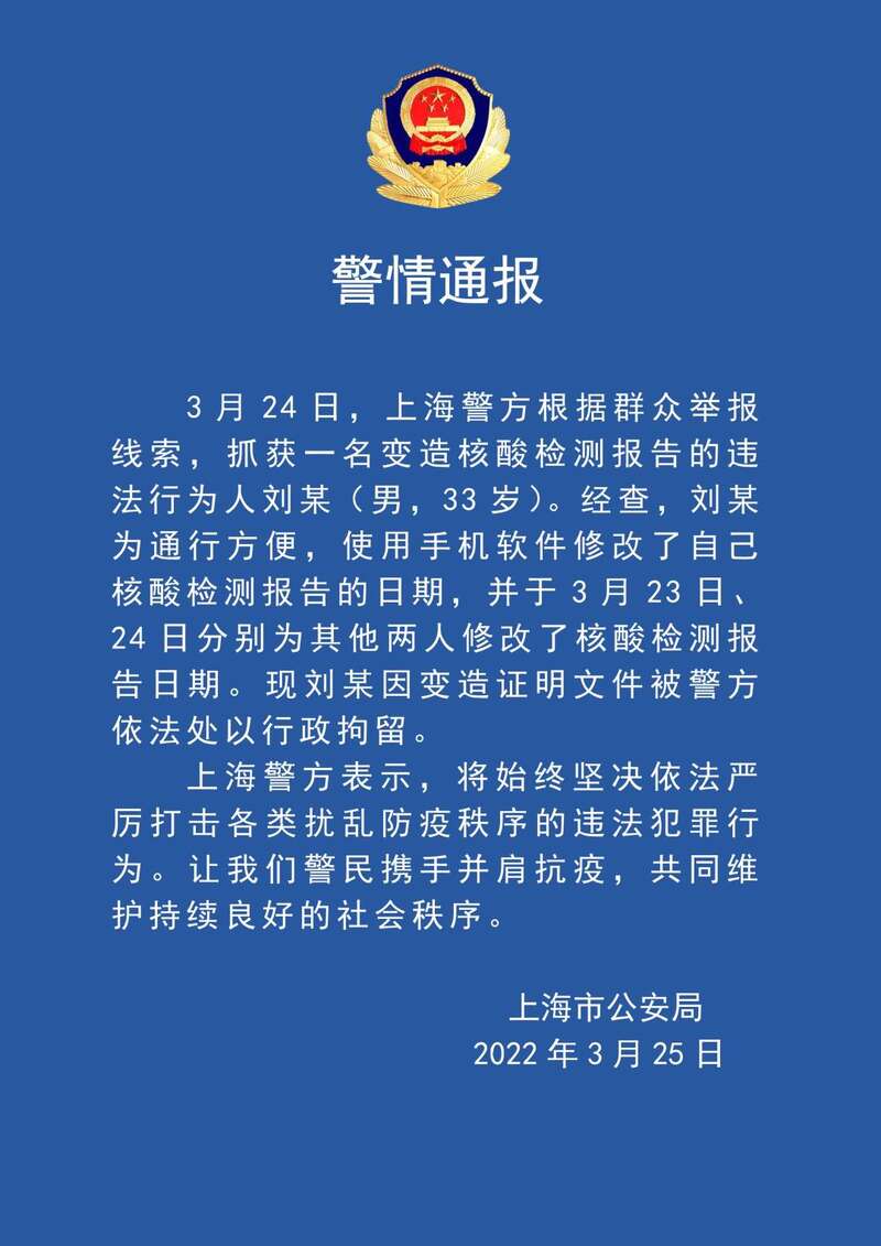 记者从上海市公安局了解到,3月24日,上海警方根据群众举报线索,抓获一名变造核酸检测报告的违法行为人刘某(男,33岁)。经查,刘某为通行方便,使用手机软件修改了自己核酸检测报告的日期,并于3月23日、24日分别为其他两人修改了核酸检测报告日期。现刘某因变造证明文件被警方依法处以行政拘留。