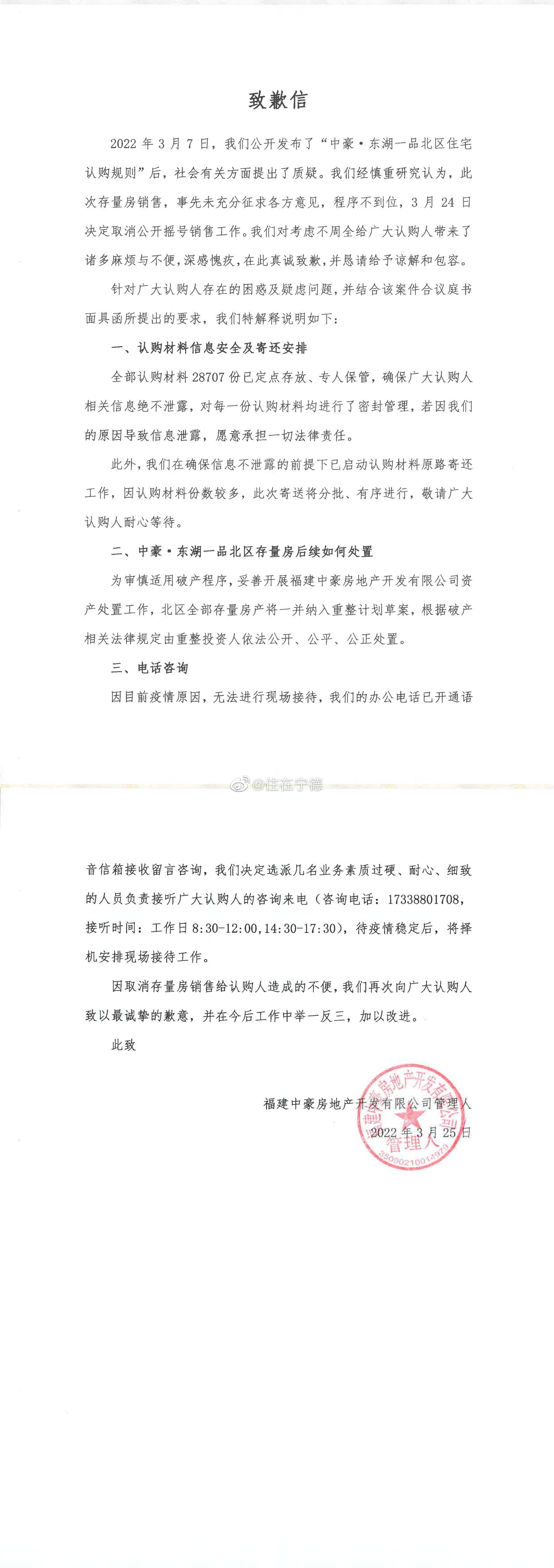 中豪公司管理人在致歉信中表示,“此次存量房销售,事先未充分征求各方意见,程序不到位,3月24日决定取消公开摇号销售工作。我们对考虑不周全给广大认购人带来了诸多麻烦与不便,深感愧疚,在此真诚致歉,并恳请给予谅解和包容。”