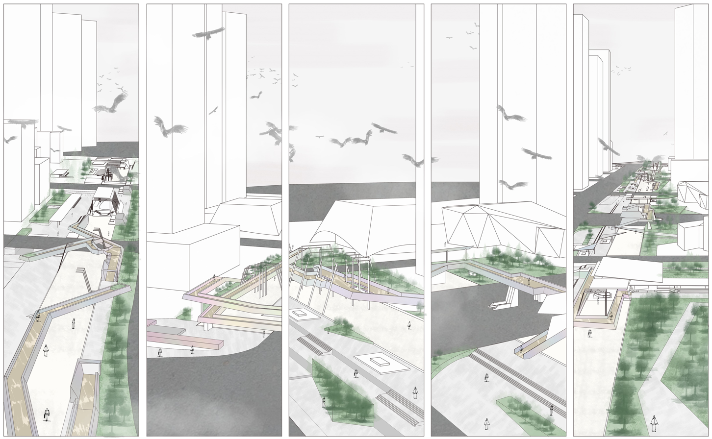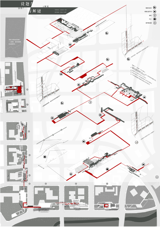 通过对金中都城墙从营建到废弃的变迁过程中的不同存在形式与金人发生行为的方式进行分析,提炼出围合、并行、渗透以及支离破碎这四种基本类型,转译出十个衔接器,衔接器与城墙地下遗存的边界发生交叠以暗示地下遗存,最终它们被场地转角处的高塔形成的线性视觉暗示连接起来,这一线性系统使城墙的记忆在现代生活中被重构起来。