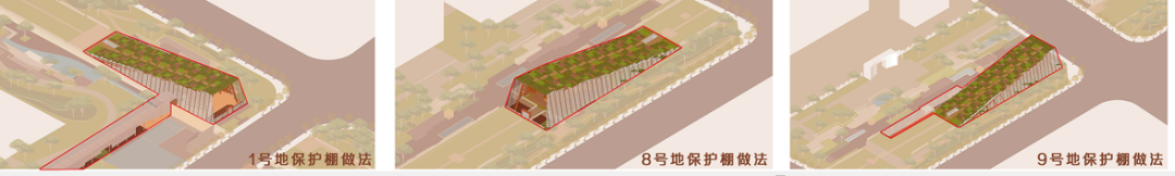 保护棚采取金代城墙尺度与意象,以体现传统木结构美感的装配式钢结构。鳞片状墙面和种植屋顶,象征着夯土肌理与礼房形态,兼具防雨、通风、除湿等功能,实现土遗址保护与历史和城市的对话。