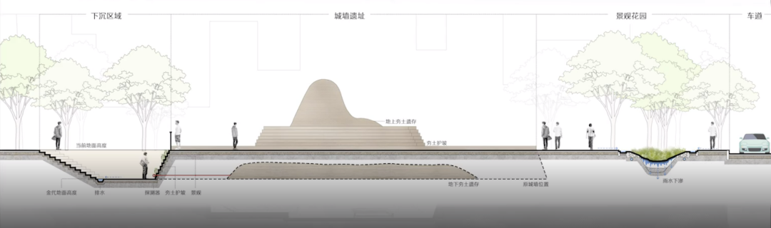 临近城市建筑一侧,利用金代地平比现代地平底1.5m的高差,形成坡上和坡下两种空间,沿遗址边界下沉,创造出连续、壮观的城墙展示面,减弱了城市噪声和周边建筑的感官侵扰,让人们在此触摸历史,感受时代变迁。
