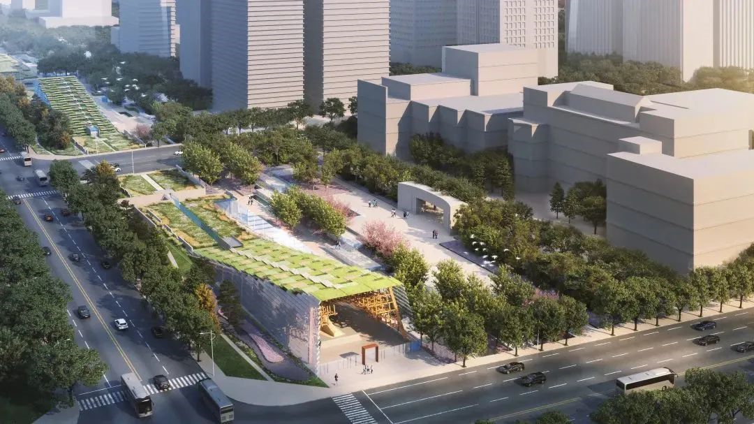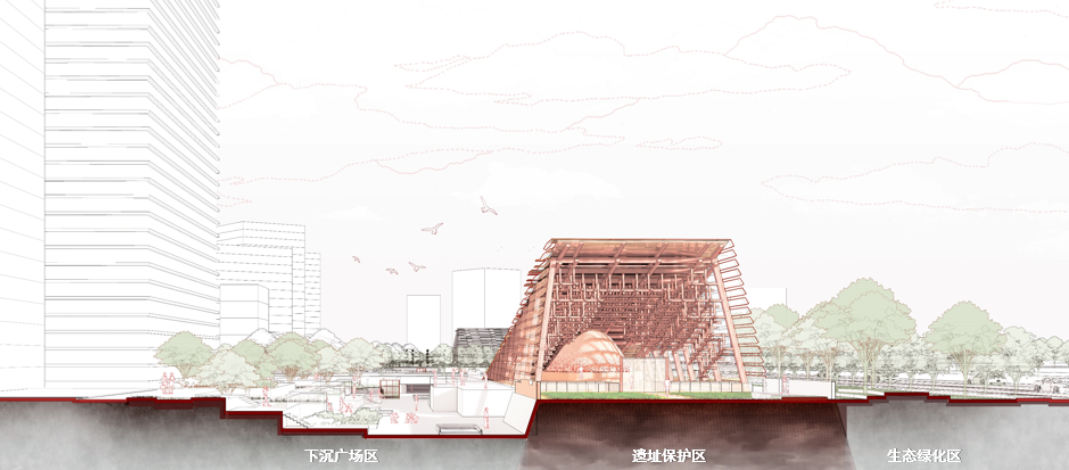 靠近城市道路的另一侧,采取结合地形起伏的密植绿化带,为市民提供舒适的慢行空间。三个文化建筑与遗址公园下沉空间紧密融合,将金中都城遗址公园打造成沉浸式的考古景观带、参与式的首都新地标、开放式的城市博物馆,实现“千年对话、古今交融”。