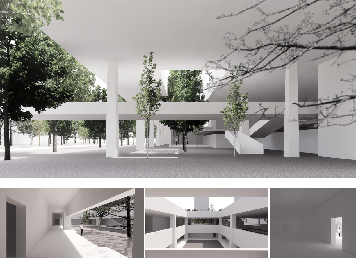 金中都城墙遗址公园设计由遗址土层提取出“层”蕴含的时间性概念,提出时空城墙的概念,让人们在标高的变化和上下穿梭与回望中感受到历史的时间感。金中都城墙遗址博物馆处于公园的“十字路口”,小组选择在保护遗址的具有整体性的大屋盖下形成较为自由的空间,实现公园的连续性。柱子设计有收分效果,既有遗址的古朴感又有在树林穿梭的自然感。