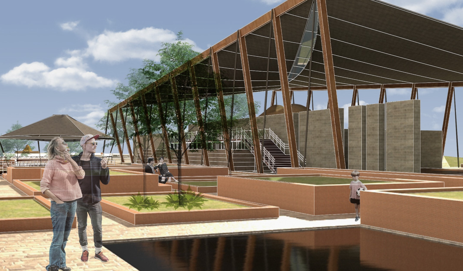 如何以一种柔和的姿态介入场地还原城墙的记忆而不是大动干戈的仿古复原,是小组成员需要解决的首要问题。最终决定将公园构建成一个中都“秘境”:秘境之内,是对中都,希望游人感受到所设计的这款关于中都记忆的拼图与重构游戏。对于遗址保护与展示设计,仍然延续拆解与重构的思路,将平面化屋顶划分出网格,让建筑形体顺应遗址形体进行初步的抬高与下沉,最后形成起伏折叠的屋面。