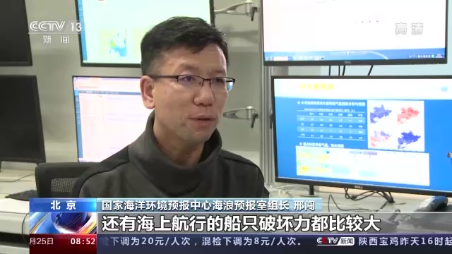 国家海洋环境预报中心海浪预报室组长 邢闯:主要影响的区域是东部海区和南部海区。灾害性海浪过程,冲击力比较强,对我们沿海的防护承载体,还有海上航行的船只破坏力都比较大。