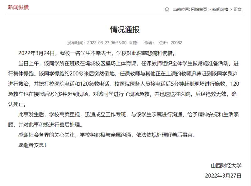 当日上午,该同学所在班级在坞城校区操场上体育课,任课教师组织全体学生做常规准备活动,进行集体慢跑。该同学慢跑约200多米后突然倒地,任课教师与其他正在上课的教师迅速赶到该同学身边进行救治,并拨打校医院电话和120急救电话。校医院医务人员接电话后5分钟赶到现场进行施救,120急救车也在接报后9分多钟赶到现场,对该同学进行了现场急救,并迅速送往医院。后经抢救无效,确认死亡。