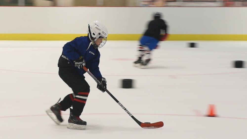 图为正在练习冰球的小球员。