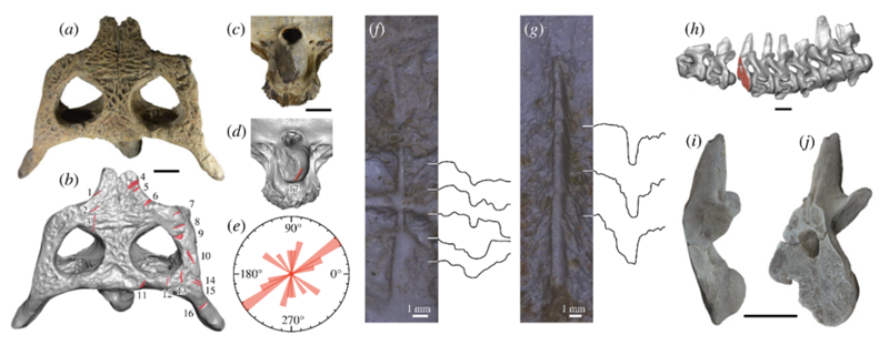 中华韩愈鳄标本头骨和颈椎的照片以及扫描影像中发现有多个攻击性伤口。