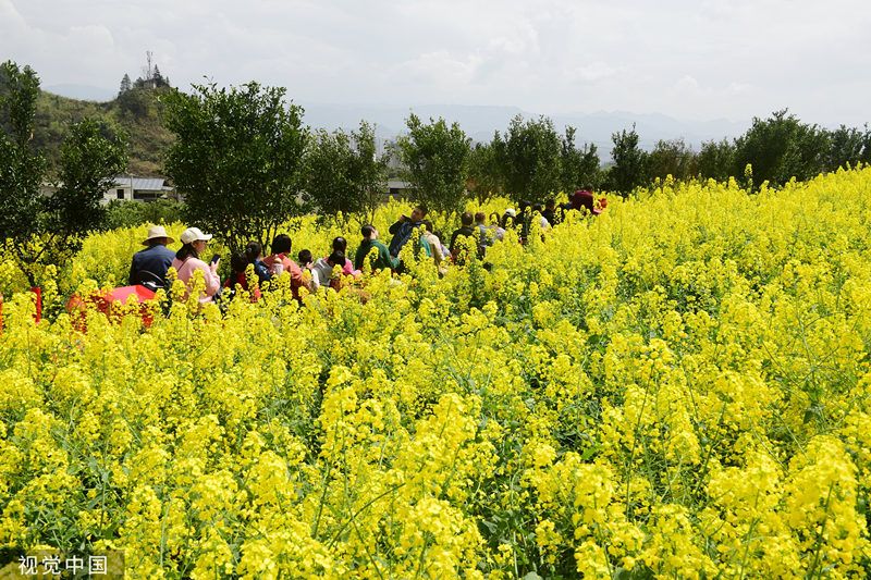 连日来,湖北省恩施土家族苗族自治州恩施市小渡船街道办事处何功伟村油菜花开,吸引了游人前来打卡游玩,游人们坐着旅游观光小火车,徜徉在花海中,乐享美好春天。