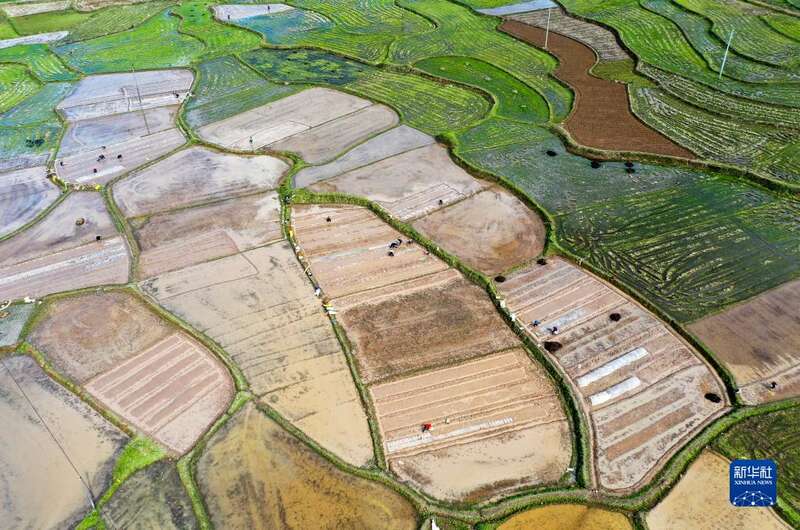 3月28日,在湖南省永州市道县白马渡镇樟武坊村,村民在农田里育早稻秧苗(无人机照片)。