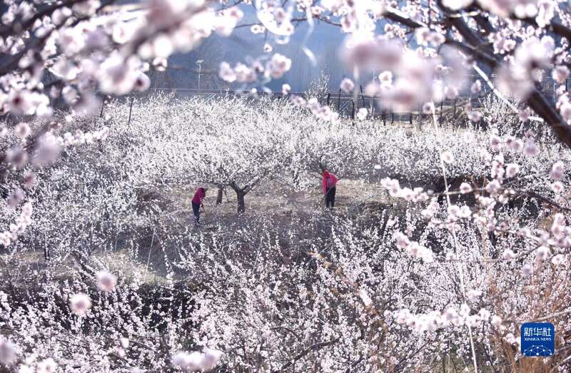 3月28日,山东省淄博市沂源县悦庄镇桃花峪村的农民在杏花田间劳作。