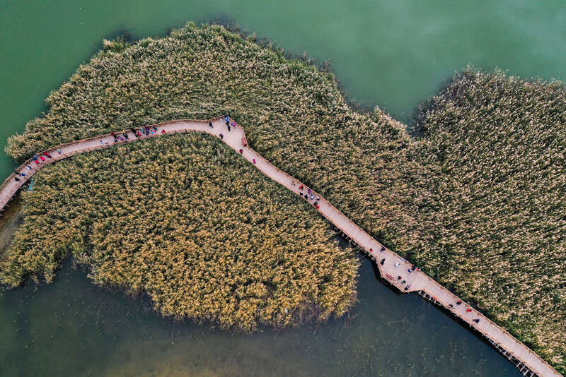 2021年10月17日,游客在居延海景区游玩(无人机照片)。新华社记者 刘磊 摄