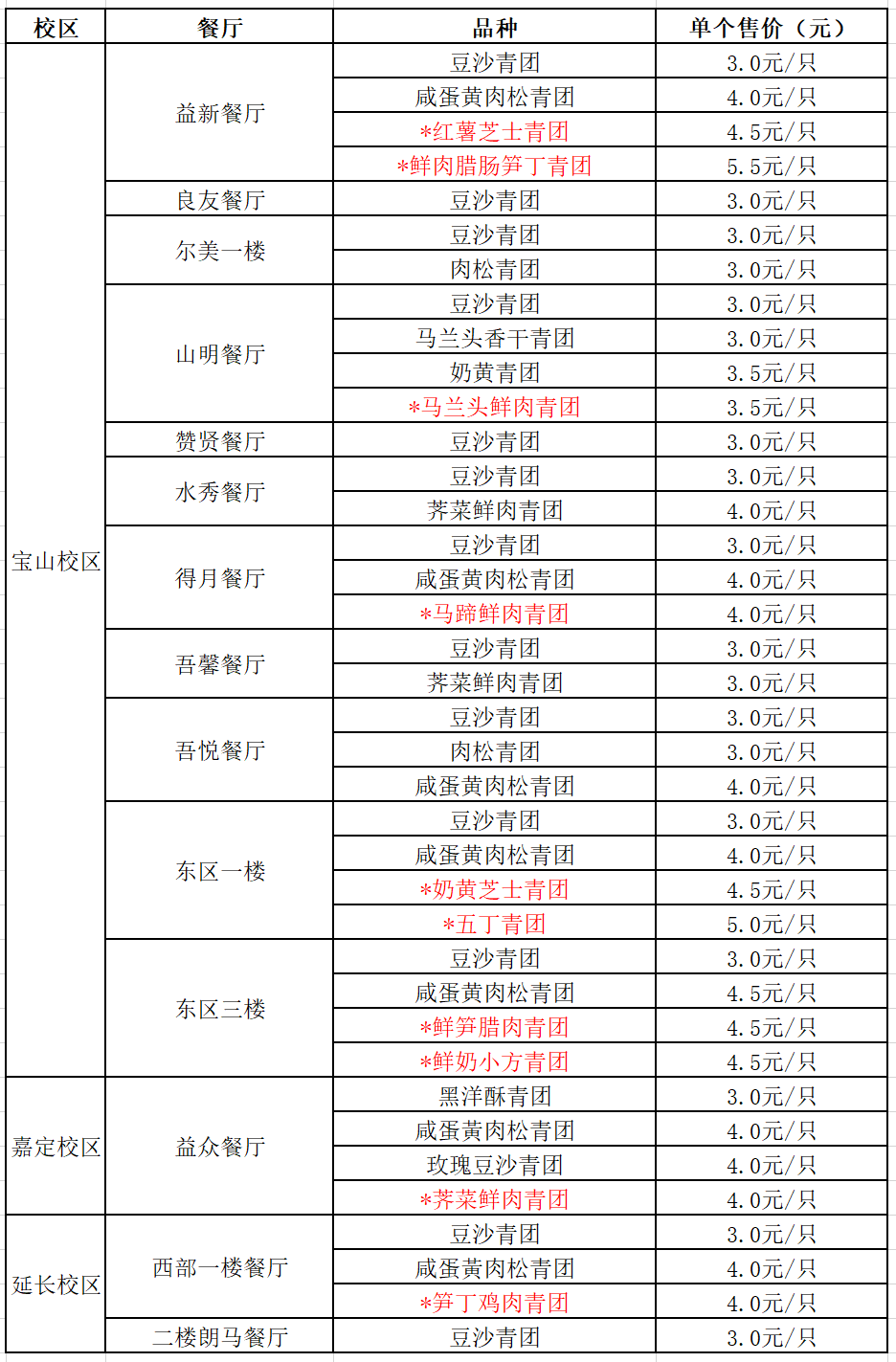 *为今年的新品特色青团,以上青团品种限量供应,为保证口感,请广大师生当日食用;