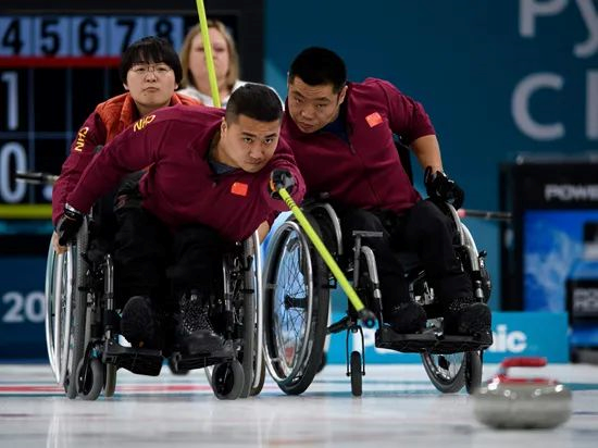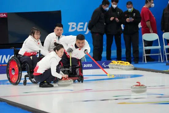 尽管轮椅冰壶比赛不能刷冰,中国队投掷时,队员们总习惯喊出“Hurry(用力刷冰)”“Whoa(停止刷冰)”等指挥刷冰用语。