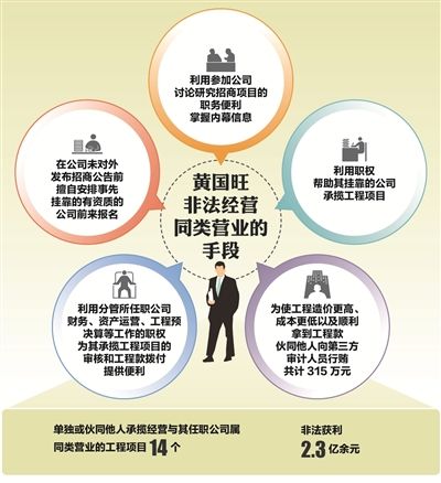 非法经营同类营业罪。2010年2月至2018年3月,黄国旺在先后担任水投公司副总经理、董事、总经理、董事长以及工投集团董事、副总经理期间,利用其负责项目招商工作、提前知晓项目信息及审核工程变更、工程款拨付的职务便利,采取挂靠其他公司的方式,单独或伙同他人出资承揽经营与其任职公司同类营业的相关工程项目14个,获取非法利润2.3亿余元。