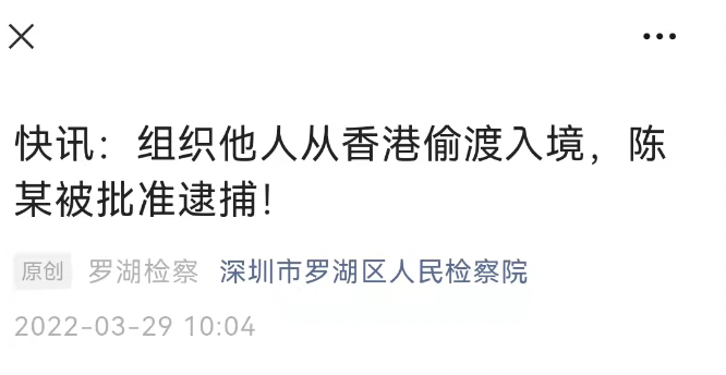 据“深圳市罗湖区人民检察院”公众号3月29日消息,28日下午,罗湖区人民检察院以涉嫌组织他人偷越国(边)境罪,依法对犯罪嫌疑人陈某(男,36岁)批准逮捕。
