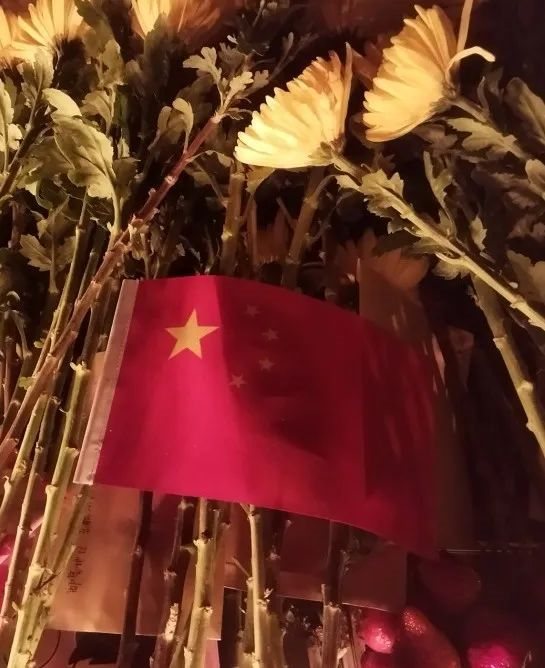 在菊花丛中放了一面国旗