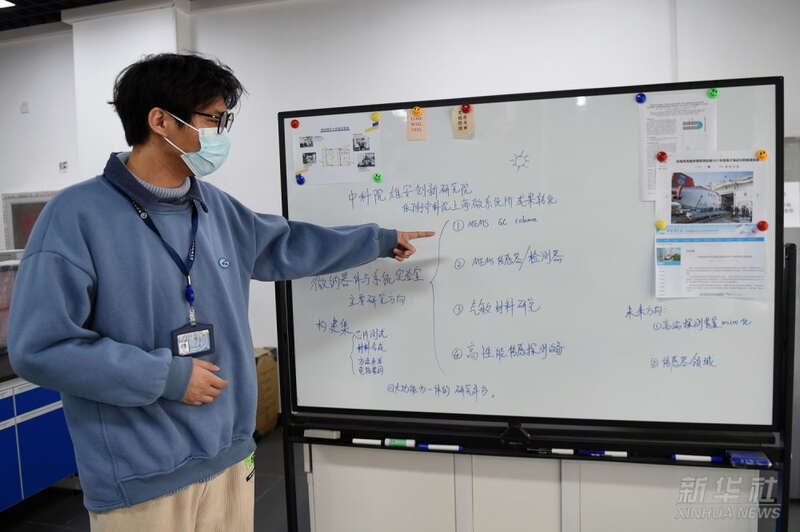 中科院雄安创新研究院工作人员介绍微纳器件与系统实验室主要研究方向(2022年3月8日摄)。2019年12月,中国科学院与河北省政府签署协议,合作共建“雄安创新研究院”,重点突破产业基础性关键技术、新兴产业核心技术和开辟新领域的变革性技术,推动研究成果转移转化。