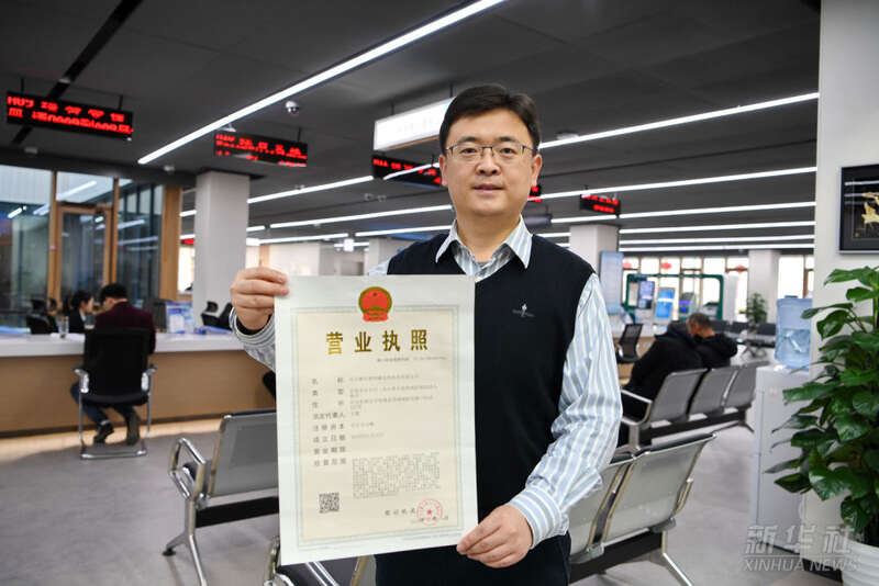 一家入驻雄安新区的企业工作人员在市民服务中心内展示办理的营业执照(2019年1月17日摄)。