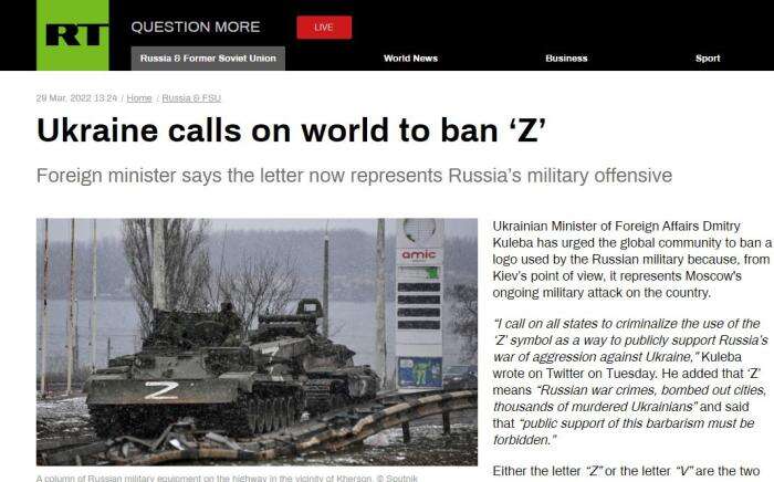乌克兰呼吁世界禁止字母“Z”。图片来源:“今日俄罗斯”报道页面截图