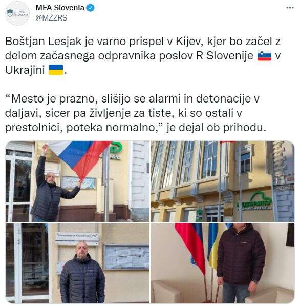 斯洛文尼亚驻乌克兰代办在驻基辅使馆复工之际发帖展示该国国旗。图片来源:推特页面截图