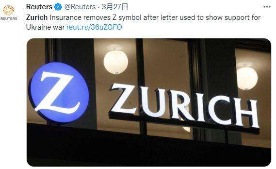 路透社报道,为支持乌克兰,瑞士苏黎世保险公司将“Z“符号撤下。图片来源:推特网页截图