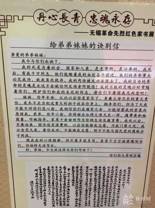 无锡市烈士陵园管理中心举办“丹心长青 忠魂永存”红色家书展,遴选一批烈士家书和生平事迹在无锡多处地铁站内展出。这些家书或写给父母,或写给弟弟妹妹,字里行间既流淌着对父母的亲切思念、对晚辈的谆谆嘱托,又洋溢着追寻革命事业的豪迈英杰之气。