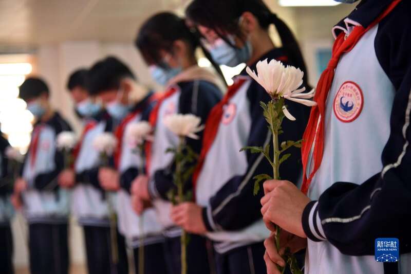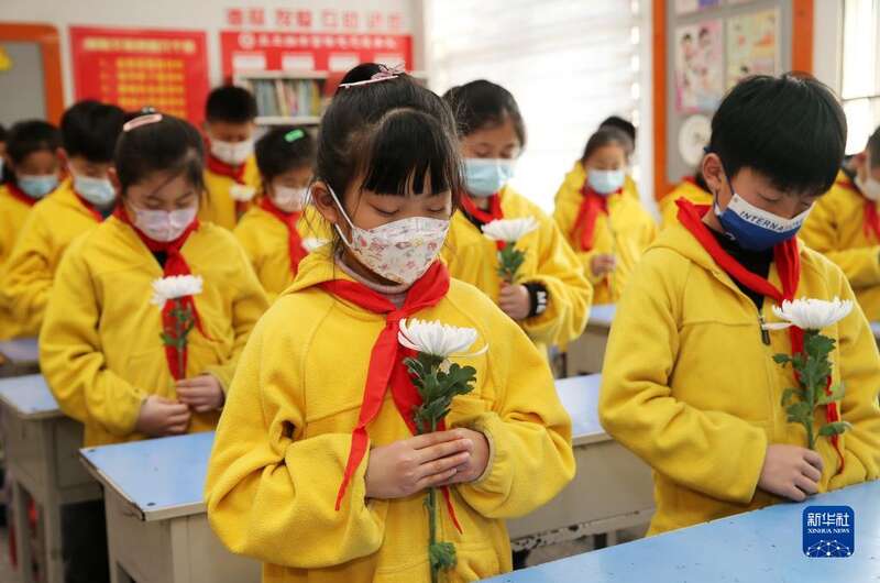 4月1日,安徽省淮北市首府实验小学学生手持鲜花通过教学网络向英烈默哀。