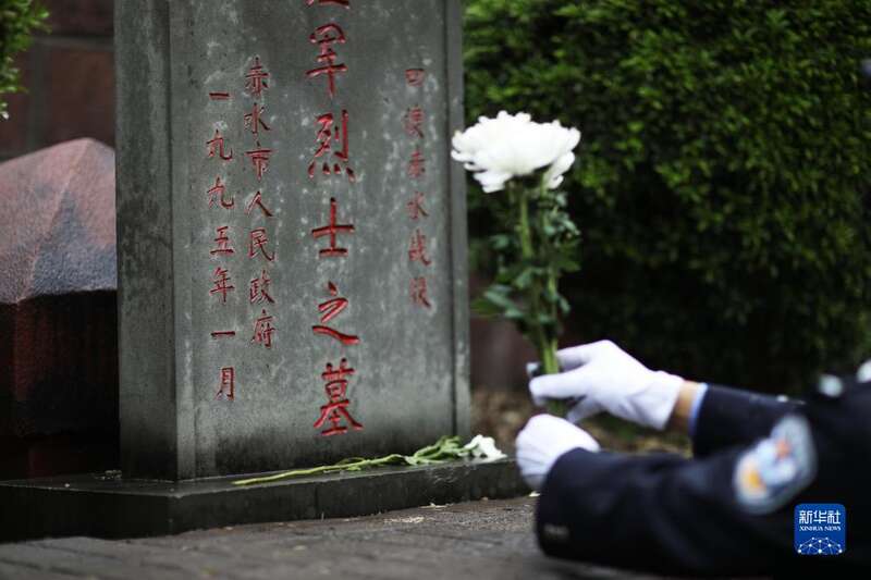 4月1日,在贵州省赤水市红军烈士陵园,民警向红军烈士墓敬献鲜花。