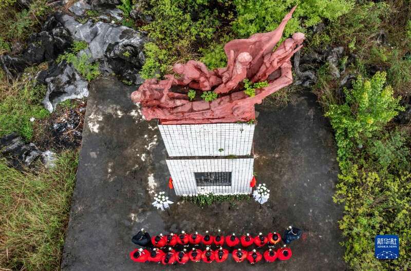 4月1日,学生在贵州省黔西市大关镇红军抢渡鸭池河天险纪念碑前默哀(无人机照片)。