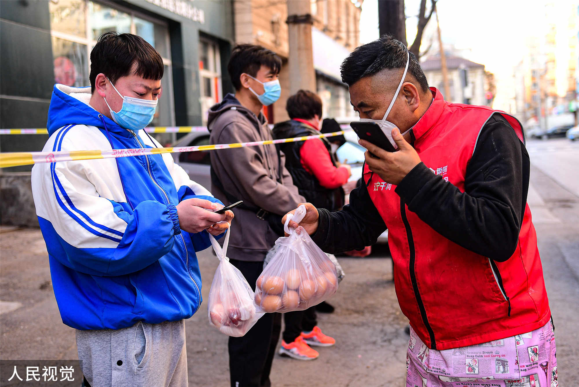 2022年4月1日,在沈阳市沈河区北二经街9号,市民在志愿者的帮助下有序购菜。疫情防控下,小区居民非必要不外出,志愿者送菜到家。