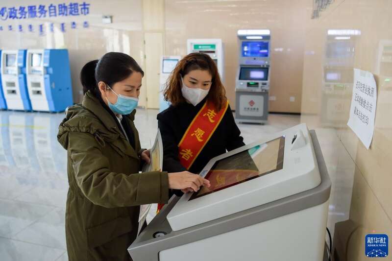 4月2日,在位于玉泉区政务服务中心的“24小时政务服务自助超市”,一位市民在工作人员指导下打印营业执照。
